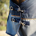 The blanket features double adjustable front chest closures, criss-cross belly surcingles, and adjustable hind leg straps for a customizable fit. A tail flap provides extra coverage and protection against wind and rain, keeping your horse comfortable during turnout, travel, or stable use.