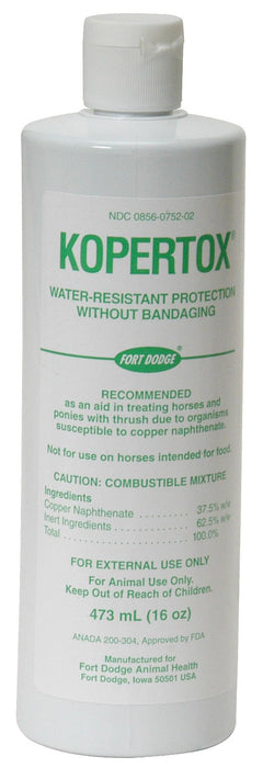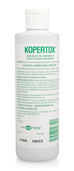 Kopertox provides water-resistant protection for the treatment of thrush in horses and ponies. Clean the hoof thoroughly, removing debris and necrotic material prior to application. Apply daily to the affected hooves until fully healed.