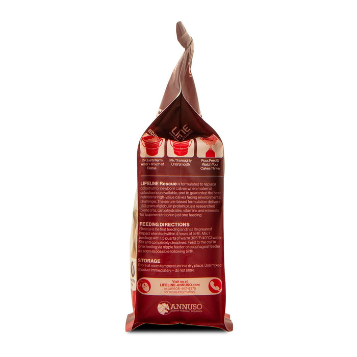 DIRECTIONS: Rescue is the first feeding and has its greatest impact when fed within 4 hours of birth. Mix 4 1/2 cups* (1.1 pounds) of Rescue with 1.5 quarts of warm (105°F/40°C) water. Stir until completely dissolved. Feed to the calf in one feeding via nipple feeder or esophageal feeder as soon as possible following birth. Use mixed product immediately - do not store.
