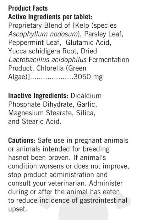 Proprietary Blend of [Kelp (species Ascophyllum nodosum), Parsley Leaf, Peppermint Leaf, Glutamic Acid, Yucca schidigera Root, Dried Lactobacillus acidophilus Fermentation Product, Chlorella (Green Algae)]...... ....... 3050 mg