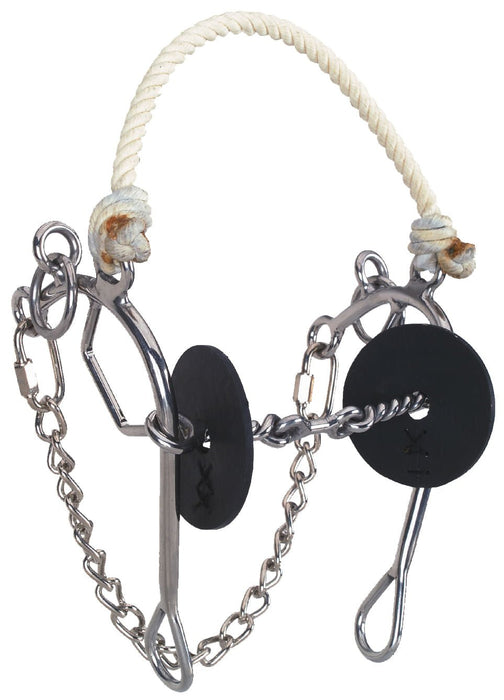 Features a 3-piece twisted wire dog bone snaffle mouthpiece and a rope nose-band. Equipped with a 5" shank.