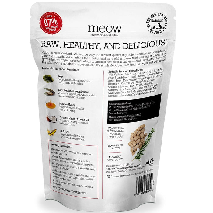 MEOW Wild Venison Freeze Dried Cat Bites are made using only the highest quality ingredients aimed at nourishing your pet's health. MEOW combines the nutrition and taste of fresh, raw food by gently freeze-drying to protect all the natural enzymes and nutrients, ensuring that none of the wholesome goodness is cooked out. Raw, natural, and delicious!