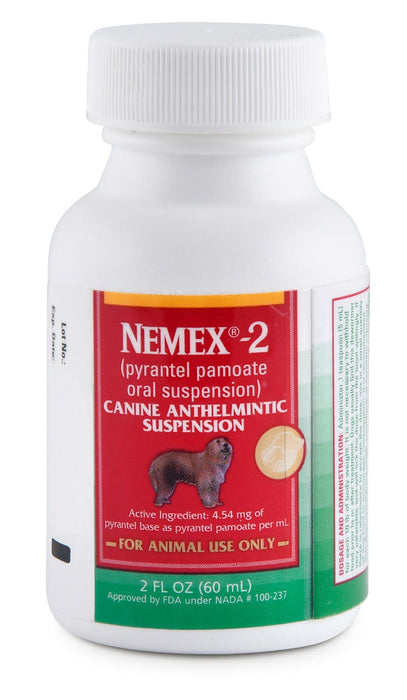 Nemex 2 is a caramel-flavored suspension dewormer of pyrantel pamoate in a palatable oral liquid intended as a single treatment for the removal of large roundworms and hookworms in dogs and puppies. Nemex®-2 suspension may also be used to prevent reinfection of Toxocara canis in puppies, adult dogs & lactating bitches after whelping.