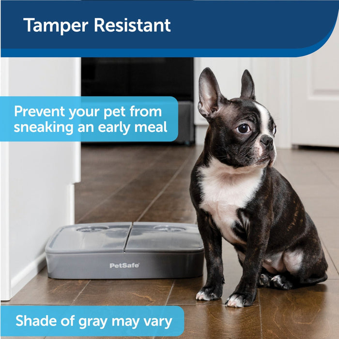 The removable inner tray has 2 compartments that each hold up to 1½ cups of dry or semi-moist food. Although your pet may use their paws to try and pry the feeder open, our tamper-resistant lids make sure that even the most persistent pets can’t get to their food ahead of schedule. When you need to clean your pet’s feeder, simply remove the tray and place it in the top rack of the dishwasher. PetSafe® brand is here to help you and your pet live happy together.
