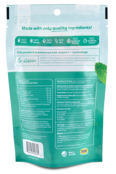 Enhanced by ADEPPT Technology, a proprietary blend designed to help balance your pet's overall health. Made with natural ingredients. Helps maintain healthy gums. Supports plaque and tartar reduction through chewing and helps to freshen breath. Made in the USA for dog use only. No grain, gluten, corn, soy, artificial colors, or flavors. Approx. 30 chews per 4.23 oz pouch.