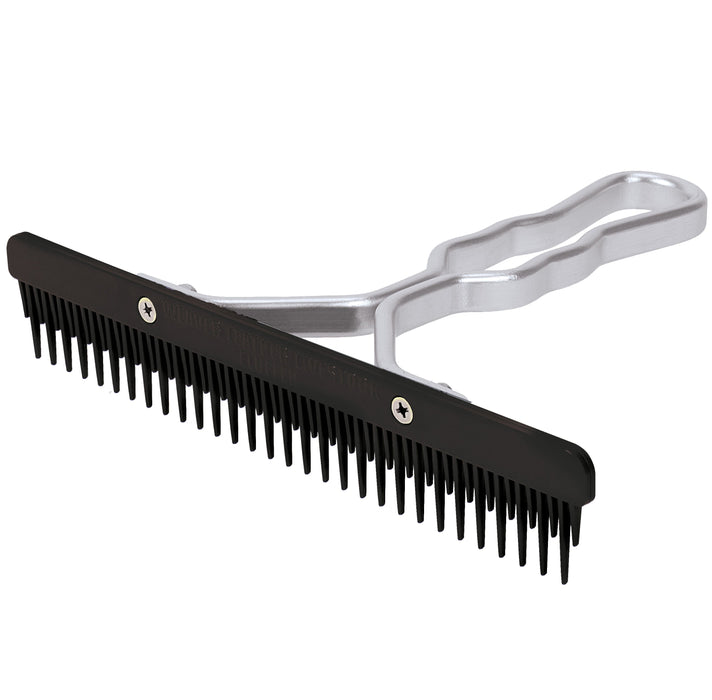 The Plastic Fluffer Comb is designed with a 9" plastic fluffer blade that can be quickly and easily replaced by unscrewing two Phillips screws. It features a sturdy aluminum handle for long-lasting durability, making it an ideal tool for grooming.