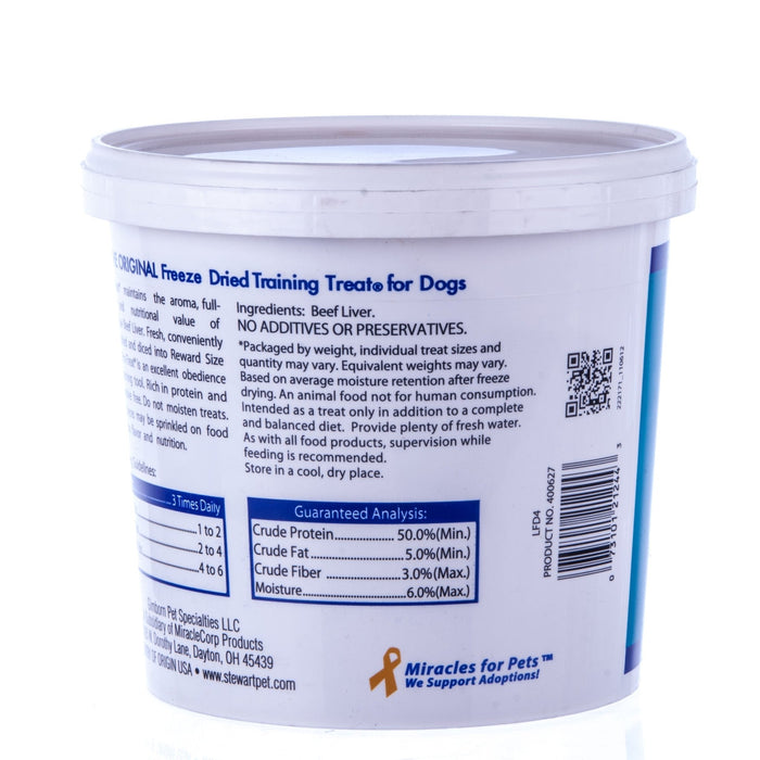Stewart Pro-Treat Freeze-Dried Treats offer dogs a healthy, high-value reward made in the USA from 100% pure ingredients—beef liver, chicken liver, or wild salmon. These freeze-dried treats preserve the rich flavor, aroma, and full nutritional value of raw protein while being less messy, fully shelf-stable, and convenient to use. Diced into bite-sized pieces, they are ideal for training, obedience, or as a tasty snack. Each treat contains no additives, preservatives, or artificial ingredients, making them perfect for dogs with food sensitivities.