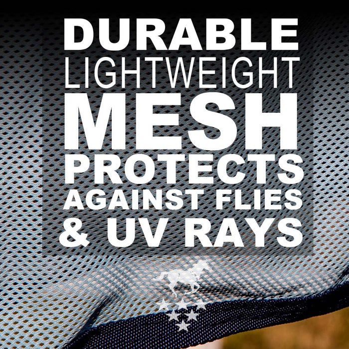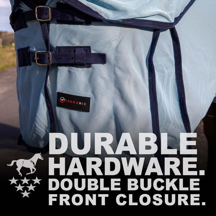 Theramic therapy meets fly protection in this versatile Theramic fly sheet. Theramic yarn is woven into durable, lightweight mesh; reflecting natural body heat in the form of long wave infrared heat radiation, which is easily absorbed by the body. Ceramic therapy is known to increase blood circulation, reduce inflammation, and ease pain. This fly sheet provides protection from flies and UV rays, and is the perfect solution for ceramic therapy in warmer climates and summer months.