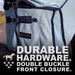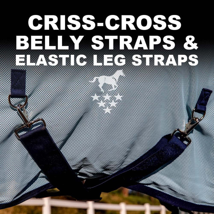 Stainless steel hardware, double buckle front closure, criss-cross belly straps and elastic leg straps keep the sheet securely in place.