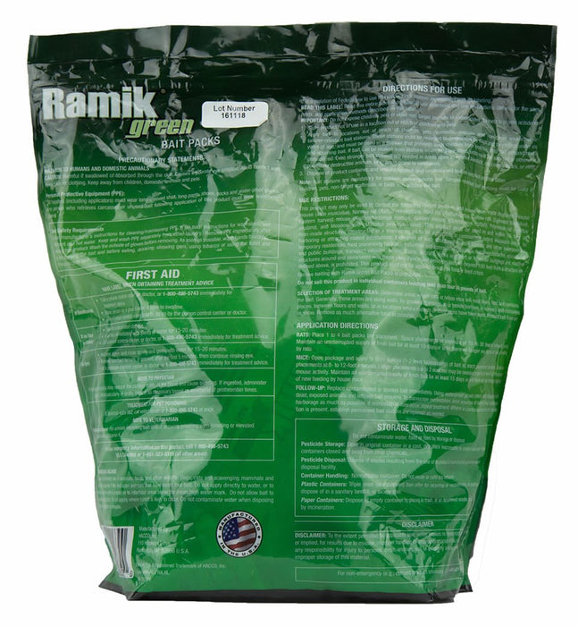 Ramik Green 4 oz Bait Packs are mold and moisture resistant and kills rats and mice within 4-5 days after a lethal dose is consumed. Bait packs come in a convenient, ready-to-use package. No need to touch the bait as rodents will gnaw open the packs.