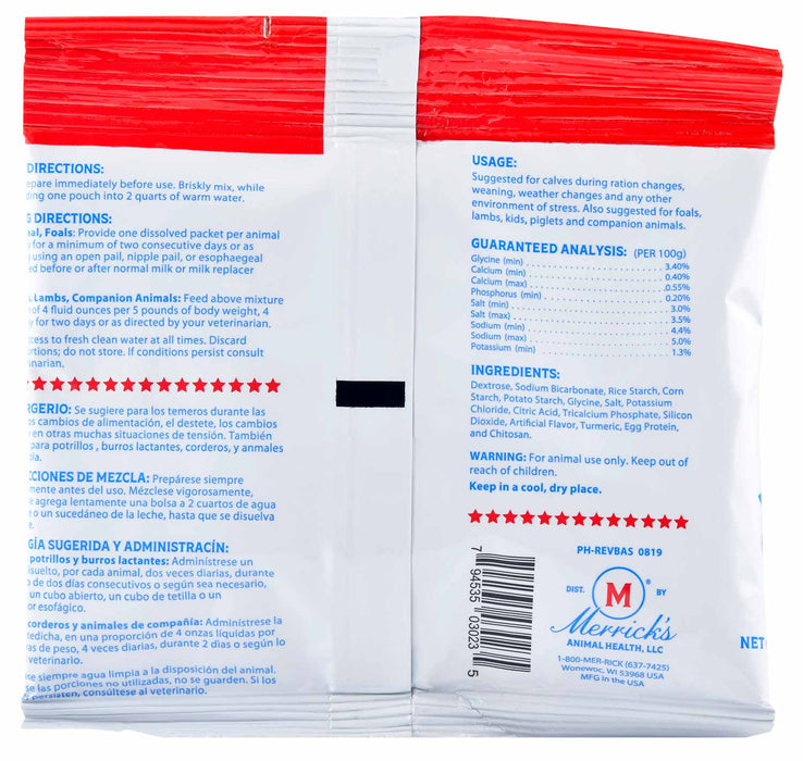 For calves, mix 3.5 oz. (one packet or scoop) into 2 quarts warm water and feed entire contents via bottle, pail, or esophageal feeder. Feed twice daily for at least two consecutive days.