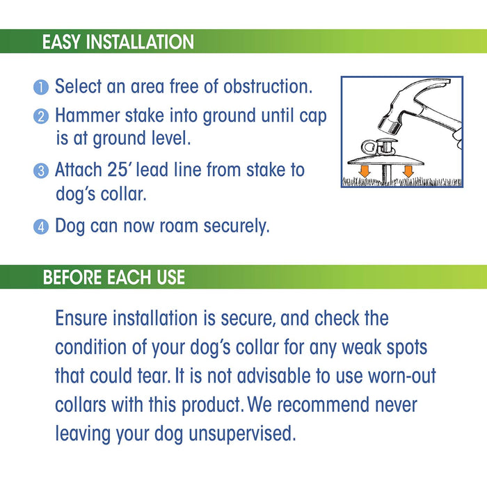 Four Paws tie-out cables and stakes help keep dogs secure while giving them room to roam. This combo package contains a Roam-About Tie-Out Stake and a medium weight tie-out cable that's designed to hold the ground firmly and not give way to tugging and pulling by your dog. Simple and functional solution.