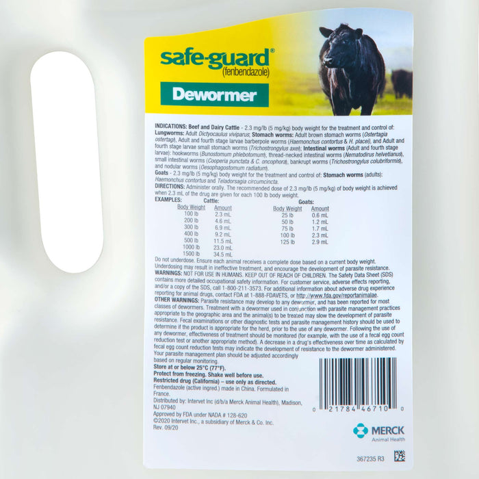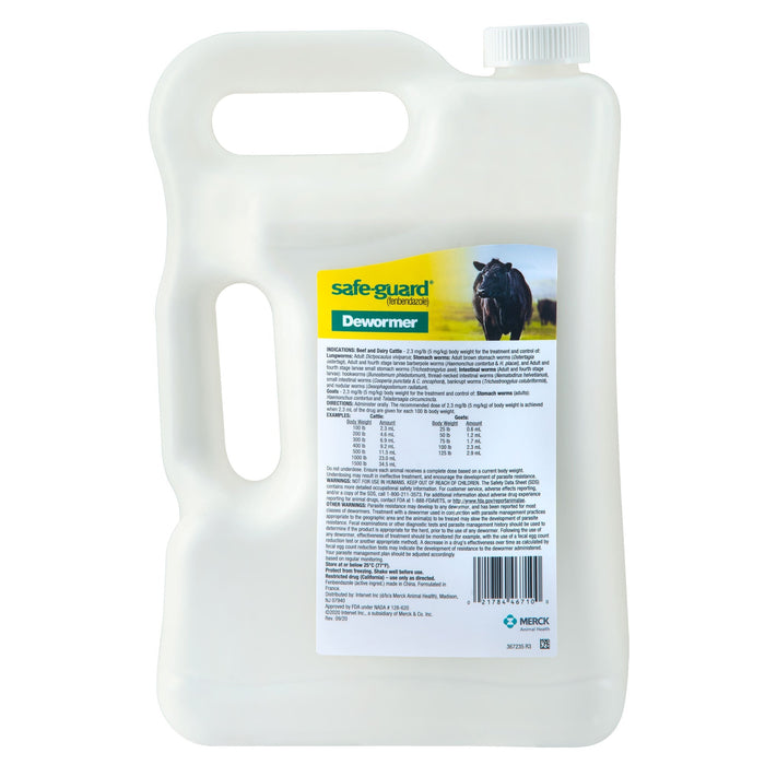 Safe-Guard 10% Suspension Dewormer is a broad-spectrum fenbendazole-based dewormer for use in beef and dairy cattle, as well as goats. It helps remove and control key internal parasites, including lungworms, stomach worms, and intestinal worms. Contains 10% fenbendazole (100 mg/mL).