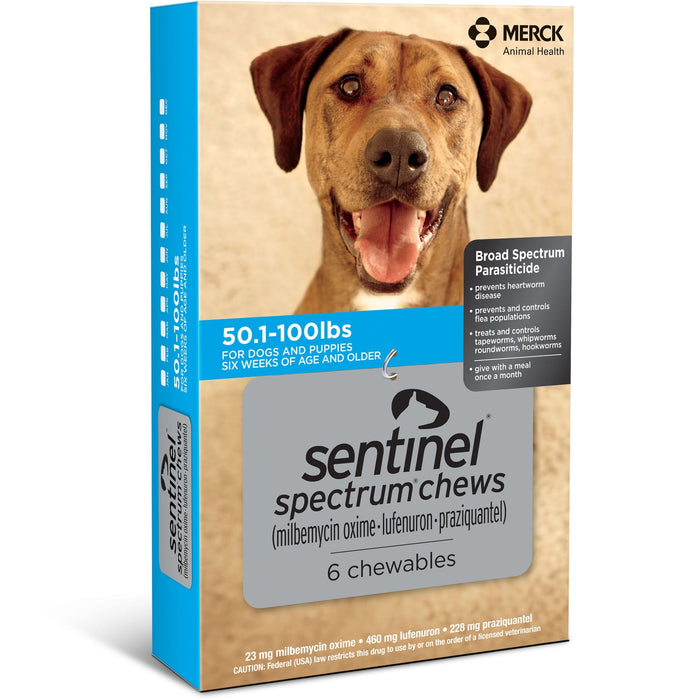 SENTINEL SPECTRUM CHEWS are indicated for the prevention of heartworm disease caused by Dirofilaria immitis; for the prevention and control of flea populations; and for the treatment and control of adult roundworm, hookworm, whipworm, and tapeworm infections in dogs and puppies two pounds of body weight or greater and six weeks of age and older.