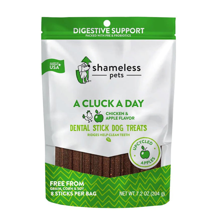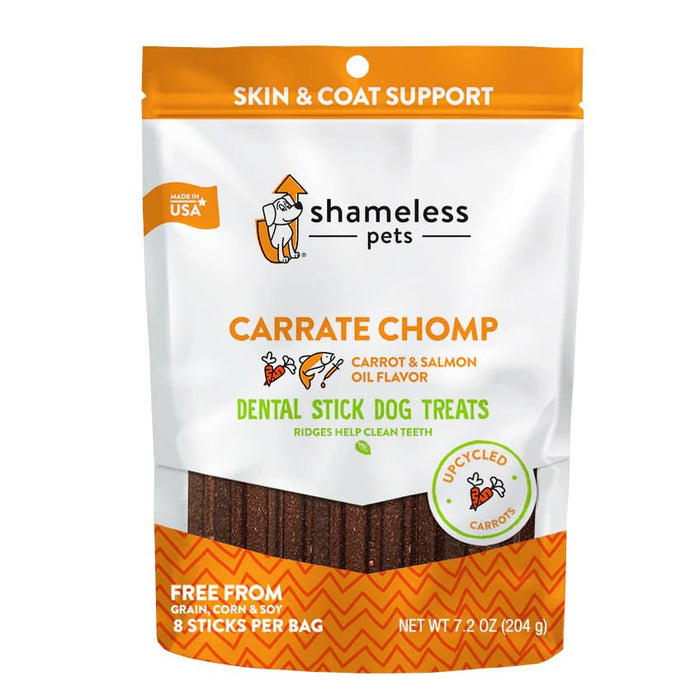 Shameless pets dental treats feature ridges in order to deep clean teeth. Added key upcycled ingredients help support your pup’s total health. Shameless Pets’ selection of healthy sustainable dental sticks contain at least 30% upcycled ingredients. These dental sticks may support several functional benefits including digestion, skin & coat, breath, immune system, and healthy hips & joints.