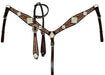 Cheetah print one ear headstall and breast collar set with rhinestone accents. This set features dark leather with a cheetah print inlay. Set is accented with large crystal rhinestone conchos, rhinestone studs and antiqued silver hardware. Headstall comes with 5/8" x 7' leather split reins.