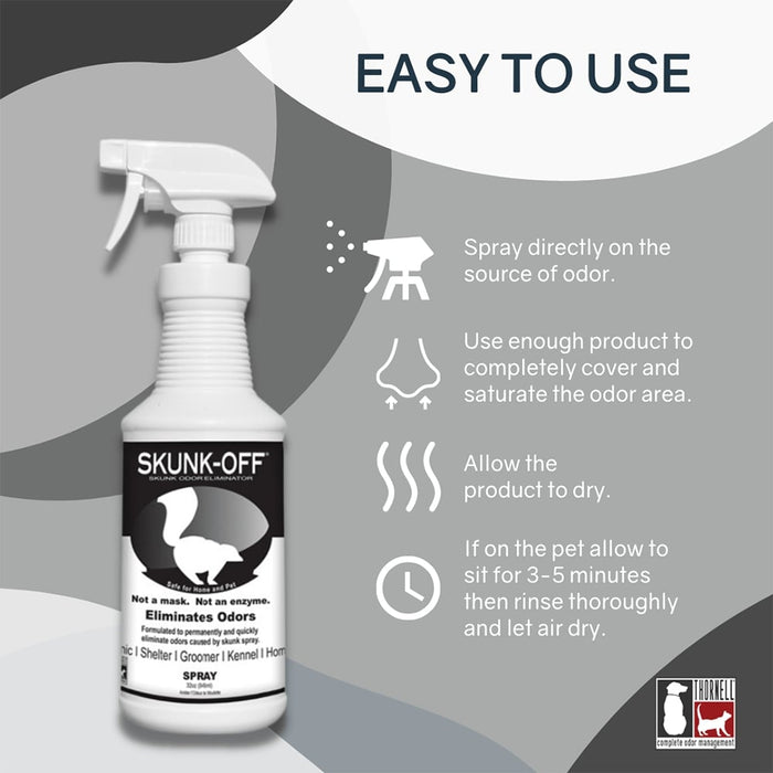 Skunk-Off destroys odor on contact and stops skunk odor instantly while it safely cleans. Specially activated chemical additives do more than just cover up the skunk odor, they actually remove it and all traces of skunk spray from affected animals, people, clothes, cars, homes or anything a skunk has sprayed or anything a skunk-sprayed animal has rubbed against. Safe, will not damage or irritate sensitive tissue of eyes, ears or nose.