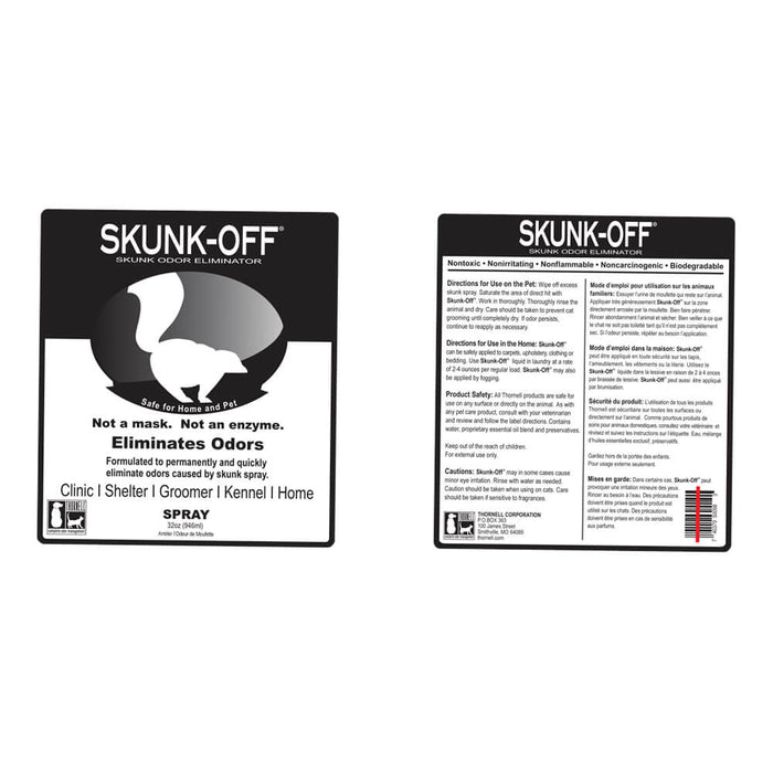 CAUTIONS/WARNINGS: Skunk-Off may in some cases cause minor eye irritation. Rinse with water as needed. Caution should be taken when using on cats. Be sure to thoroughly rinse if using Skunk-Off on cats. Cats are natural groomers they continually lick their hair coat. Skunk-Off in the cat's mouth is not dangerous but it may cause excessive drooling. Keep out of the reach of children. For external use only. Product Safety: All Thornell products are safe for use on any surface or directly on the animal. As with any pet care product, consult with your veterinarian and review and follow the label directions.