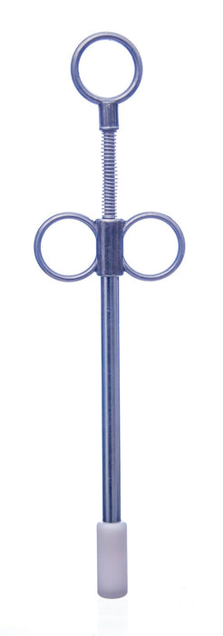 A spring loaded steel Bolus Gun with two interchangeable heads for the 1/4" and 3/8" diameter boluses.