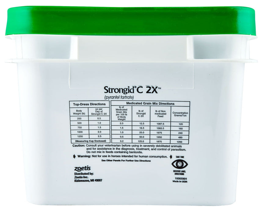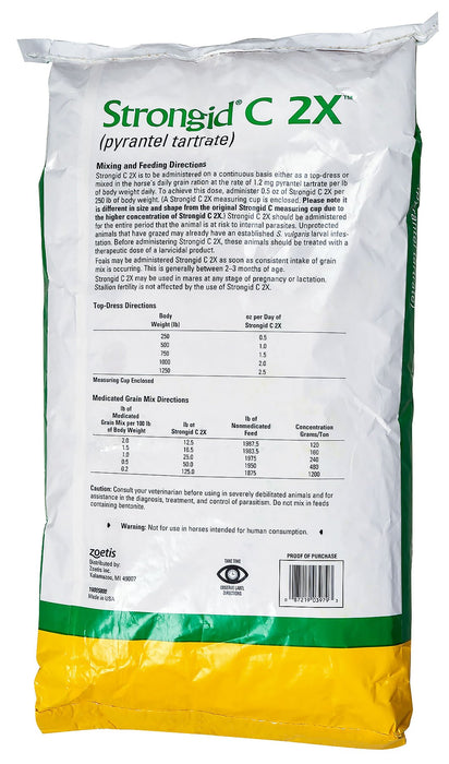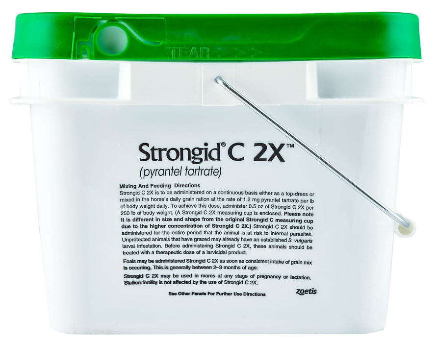 A medicated horse dewormer pellets for daily feeding to help prevent strongylus vulgaris larval infestation. Strongid C 2X helps break the cycle of parasite infections, particularly in high-risk ages or environments. It is safe for all horses including foals, mares, and stallions.