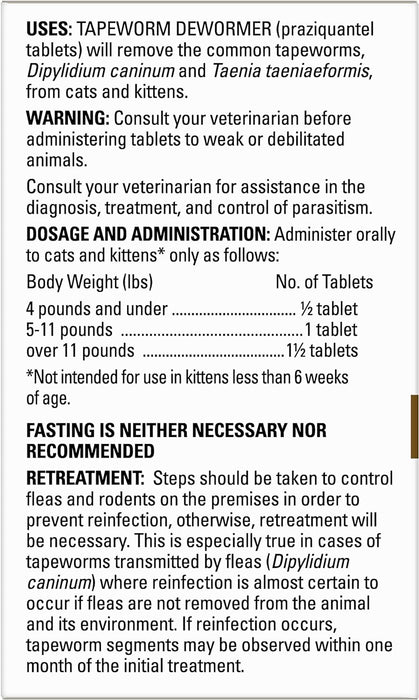 The tapeworm tabs may be crumbled and mixed with food for administration. Safe for cats and kittens over 6 weeks of age.