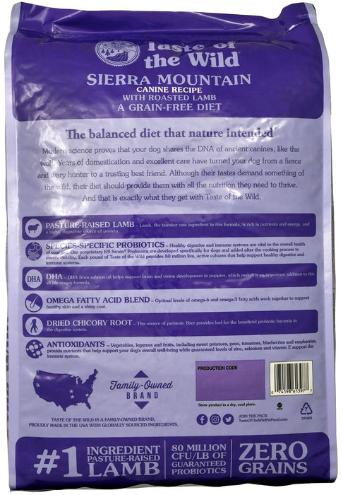 Taste of the Wild Sierra Mountain is a grain-free dry dog food featuring pasture-raised lamb as the first ingredient. This high-protein, nutrient-rich formula includes sweet potatoes and peas for easily digestible energy and fiber. It’s crafted for dogs of all breeds and life stages—including large breed puppies—to support digestion, immunity, and overall health with real ingredients and species-specific probiotics. It contains no grains, corn, wheat, artificial colors, flavors, or preservatives. Made in the USA by a family-owned company using trusted, globally and domestically sourced ingredients.