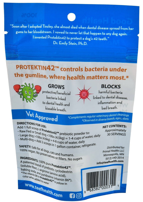 Most dental products for pets don't really attack the root of the problem or they are indiscriminate in their approach, killing beneficial bacteria as well as the problem bacteria. TEEF! offers a different alternative with no preservatives or fillers. The patented Protektin42 formula is a prebiotic powder comprised of just 4 pure, bioactive ingredients. Safe and so easy to use, it balances the dog's oral microbiome to stop the bad and grow the good. Made in the USA.