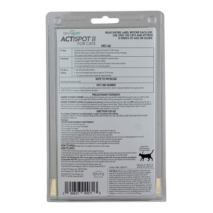 TevraPet Actispot II for Cats is a broad-spectrum topical treatment designed to protect your cat from fleas and lice. Formulated with imidacloprid and pyriproxyfen, the same active ingredients as Advantage II, this treatment not only kills fleas but also repels them, providing powerful protection for your feline friend. Actispot II works by breaking the flea life cycle, effectively preventing reinfestation, and is safe for cats 8 weeks and older that weigh more than 1.5 pounds. The waterproof, easy-to-apply liquid formula ensures your cat stays protected even in wet conditions.