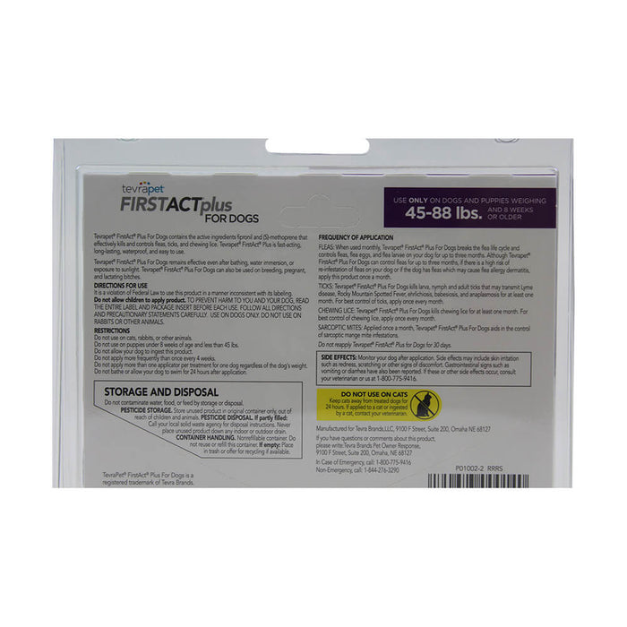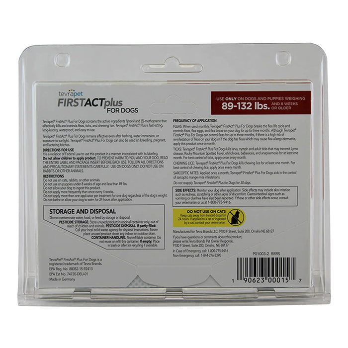 Prevent your pupper from turning pests into house guests with TevraPet FirstAct Plus Flea & Tick Treatment. This vet-quality treatment offers comprehensive protection from fleas, ticks, and lice, containing a total of three treatments that are paw-fect for dogs weighing most sizes. The topical liquid form is waterproof and convenient for both you and your canine companion. Formulated with the active ingredients fipronil and (S)-methoprene, it eliminates existing fleas, prevents flea eggs and larvae from developing, and protects from all stages of ticks and lice—giving your dog effective, long-lasting protection.