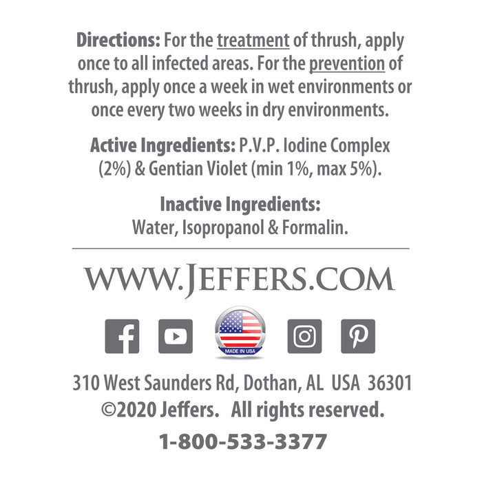 This product contains iodine, which is effective in killing bacteria and fungi responsible for thrush. However, iodine may cause staining and should be used with caution around light-colored hooves or tack. Individuals or animals with iodine sensitivities should avoid use or consult a veterinarian before application.
