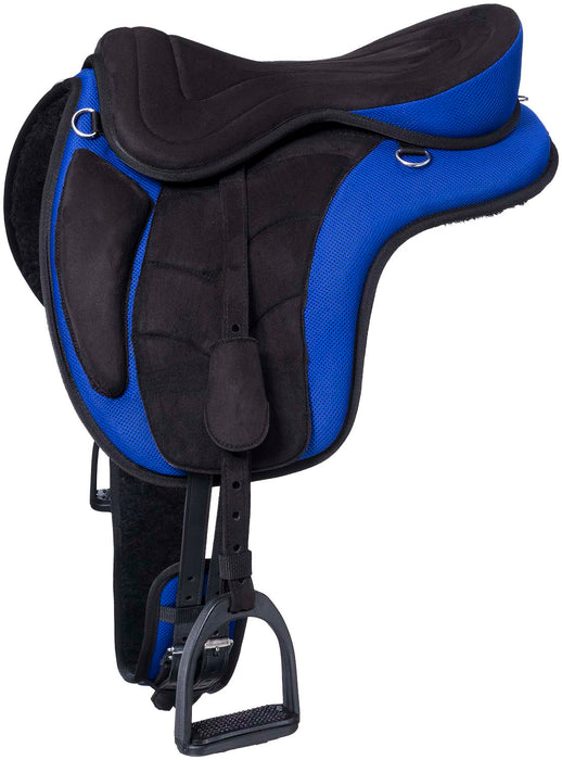 Lightweight and comfortable! Features a padded, wide, synthetic suede seat with attached handle for a secure and comfortable ride. Equipped with 2 dee rings at the front of the saddle, 2 on the side, and 1 in the back for attaching gear. Includes leathers and stirrups. Designed for trail use. The easy-to-clean synthetic material is super lightweight and comfortable. Medium is equivalent to English 17" and Large is equivalent to English 19".
