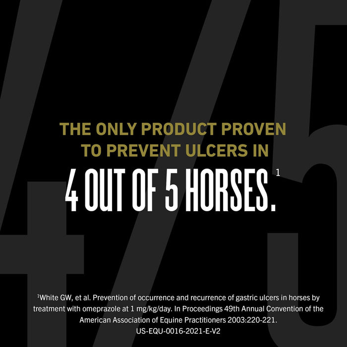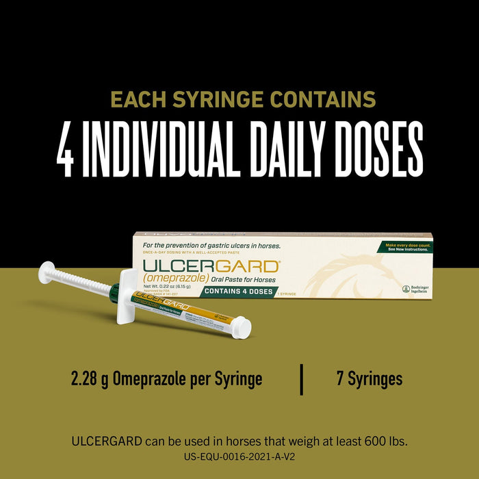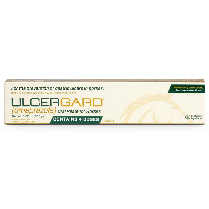 Each easy to administer tube contains 2.28 grams of FDA approved omeprazole for horses to aid in the prevention of gastric ulcers. UlcerGard is a non-prescription preventative for Equine Gastric Ulcer Syndrome (EGUS), a painful condition that can reduce your horse's performance and can even lead to death.