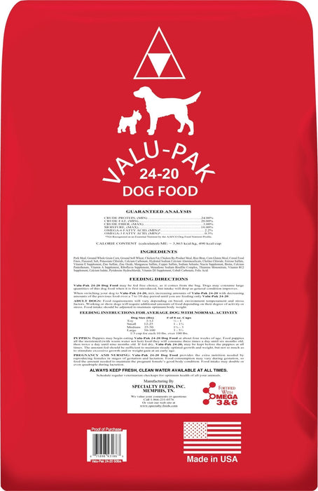 Valu-Pak 24-20 Dry Dog Food is a high-protein, high-fat formula designed for active dogs and puppies. It provides complete and balanced nutrition for all life stages except the growth of large breed puppies (70 lbs or more as an adult). This dry dog food includes quality animal proteins, Omega 3 & 6 fatty acids, and natural sources of glucosamine and chondroitin to support joint, skin, coat, digestive, and immune health. Free from artificial colors, flavors, and preservatives.