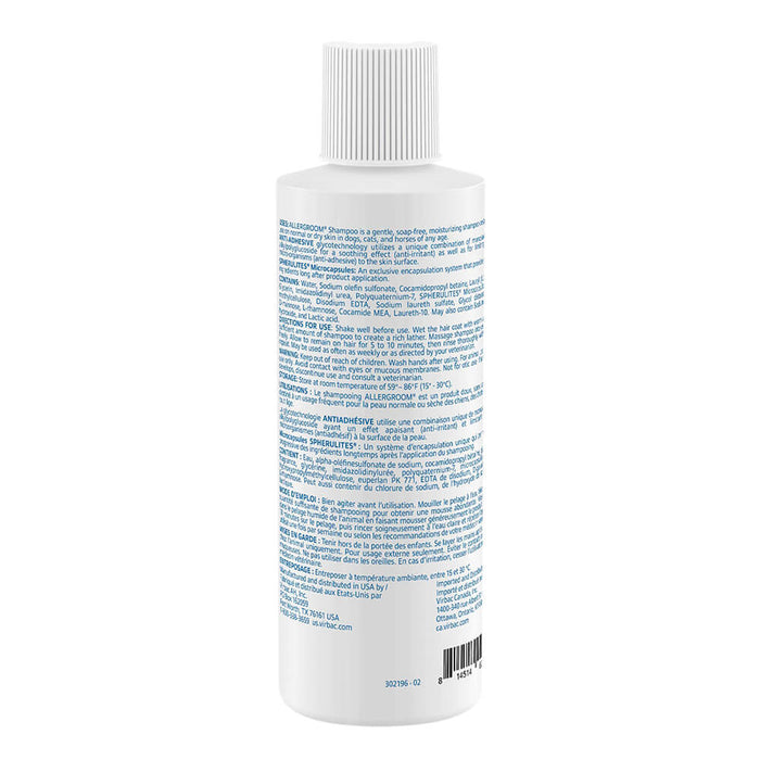 Shake well before use. Wet the coat with warm water and apply sufficient shampoo to create a rich lather. Massage Allergroom into the wet coat and lather freely. Rinse and repeat. Allow the shampoo to remain on the hair for 5 to 10 minutes before rinsing thoroughly with clean water. Use once weekly or as directed by your veterinarian.