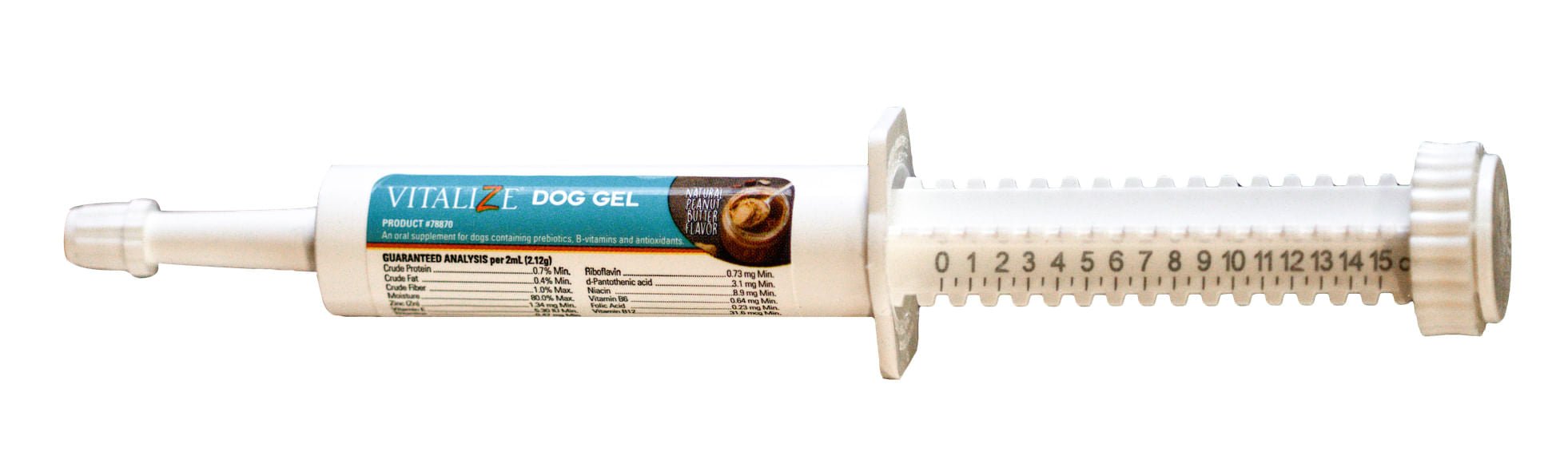 Vitalize Dog Recovery Gel is a 3-in-1 gel that provides faster recovery during stressful times such as high performance, antibiotic therapy, worming, surgery recovery, sickness, or digestive upset. Contains the right balance of vitamins, minerals, amino acids, and antioxidants, as well as MOS and Amaferm for maximum support of immunity and stress recovery.