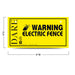 These bright yellow laminated vinyl signs feature bold black "Electric Fence" lettering on both sides for clear visibility. One side is in English, and the other side is in Spanish. Each sign has two holes for easy wiring to a fence or nailing to a post, providing a durable and effective warning system.