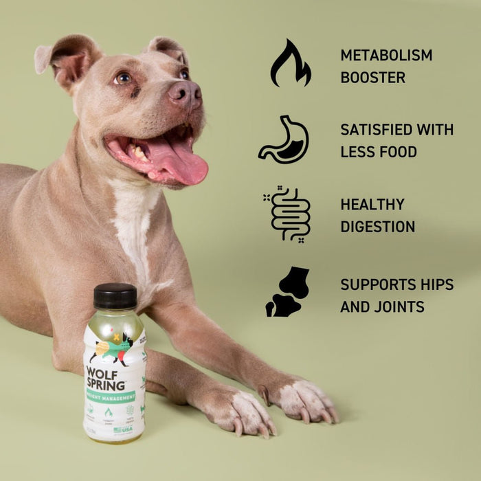 Help your dog shed more than fur! Wolf Spring Weight Management has been formulated to support healthy weight loss. Adorable no matter their size, Wolf Spring focuses on keeping our dogs healthy by getting them to their ideal weight! Besides all the great and effective ingredients, using Wolf Spring as a food topper also promotes weight loss by increasing the volume of their meal, making dogs think they're eating more and it also slows down fast eaters.