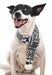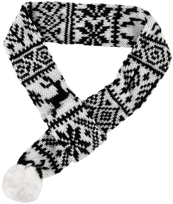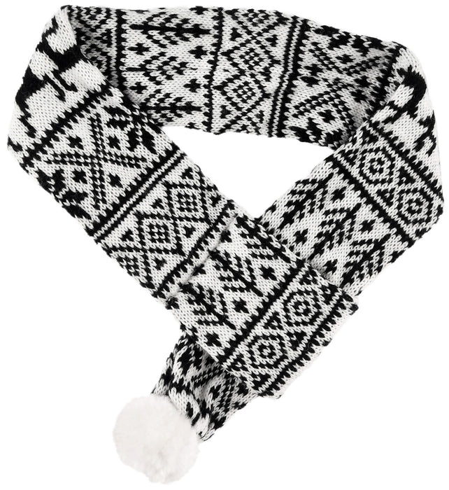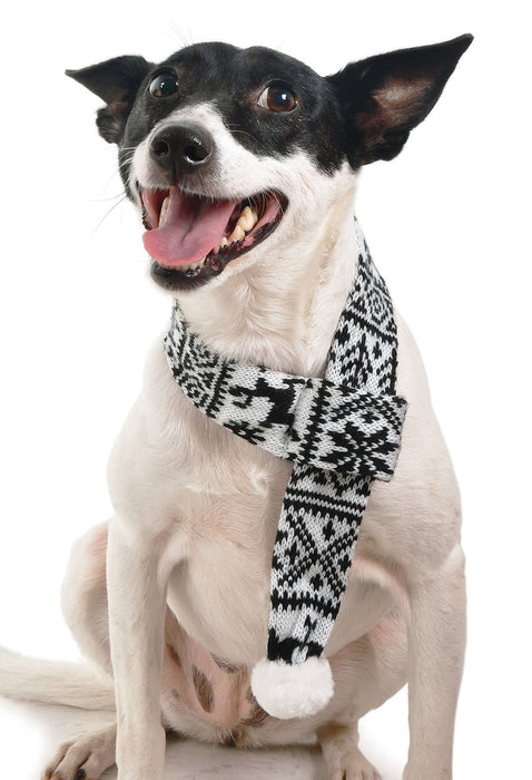 This fashionable scarf for your dog has a classic wintry motif. The soft knit white scarf has reindeer, snowflakes, and trees incorporated into the design and white pom-pom accent at one end. Perfect for the holidays and sure to complement your decor.