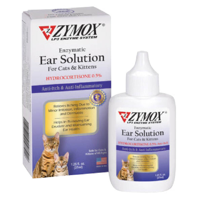 ZYMOX Enzymatic Ear Solution with 0.5% Hydrocortisone contains a patented combination of enzymes for the relief of ear infections and maintaining ear health. Veterinarian Recommended and endorsed by TICA, The International Cat Association. ZYMOX Enzymatic Ear Solution with 0.5% Hydrocortisone promotes healthy ears and relieves itching due to minor inflammation, dermatitis, and other minor skin irritations. ZYMOX Ear Solution’s advanced technology makes caring for a pet’s ears easy and fear-free with reduced touching of sensitive ears. Contains no antibiotics or harsh ingredients. For use on any age dog or cat.